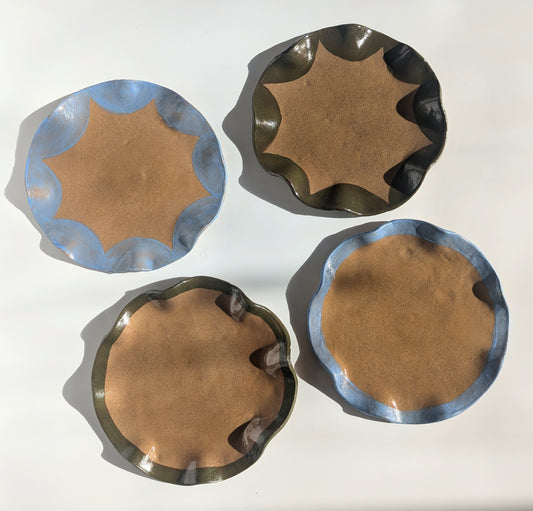 Set of Four Baby Blue & Smokey Olive Wavy Scalloped and Bordered Side Plates