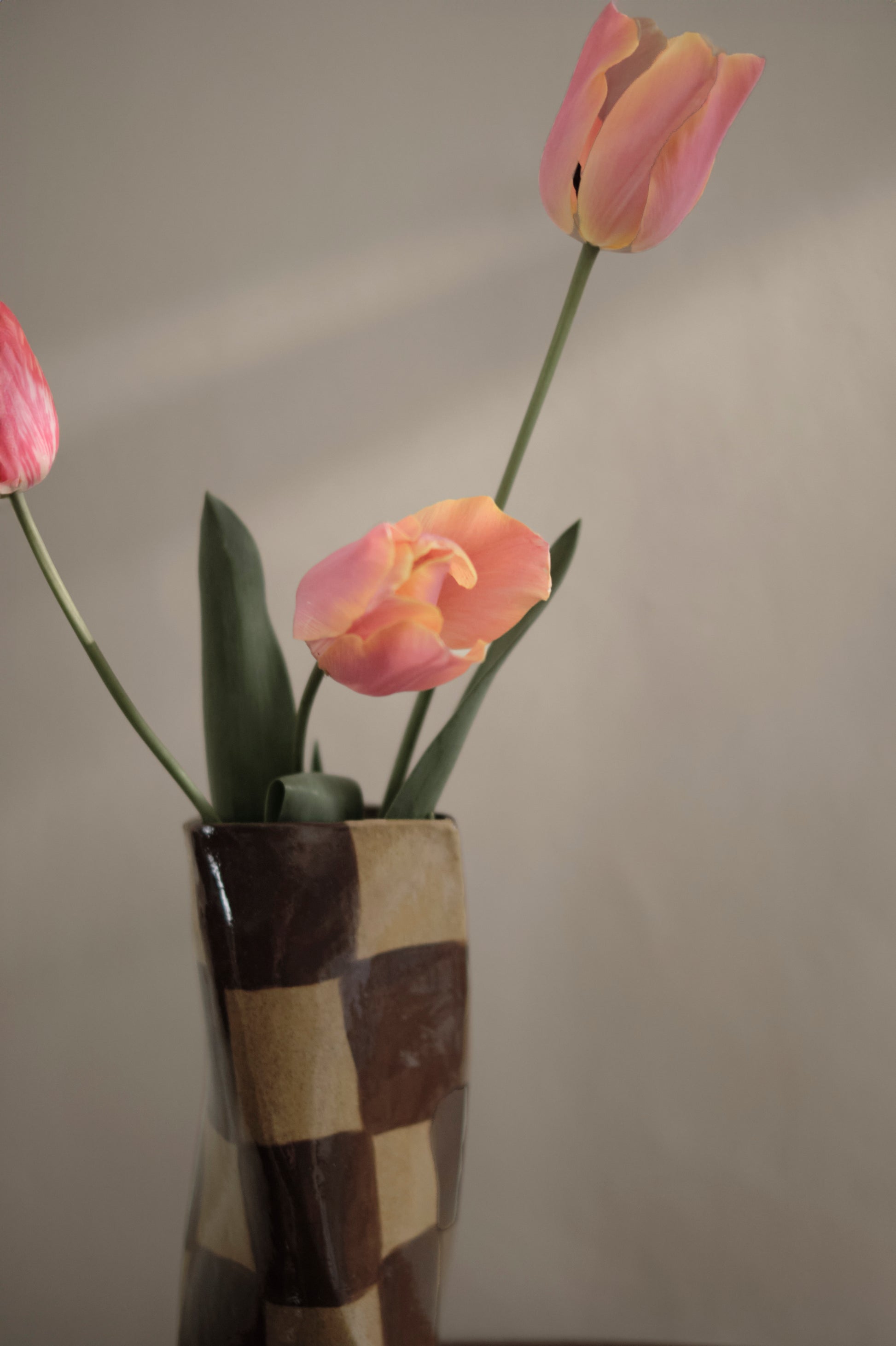 Our ceramic stoneware twisting checked vase is a perfect statement piece for any mantel, sideboard or dining table. Designed and made by us in London, this charmer is completely waterproof and the perfect size for a large bunch of flowers.