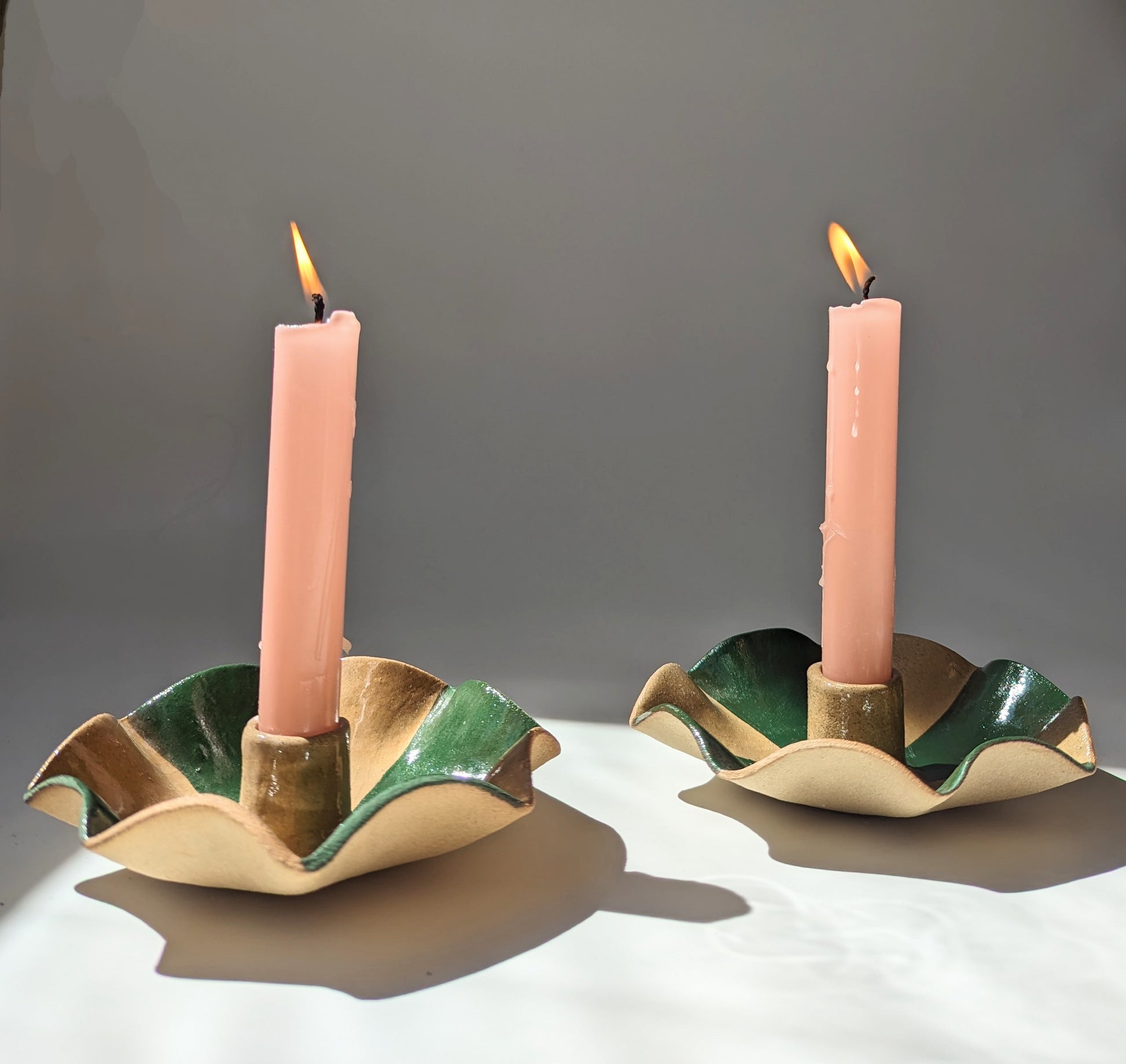 Here are our irregular, scalloped striped candle holders. Hand built in toasted stoneware ready to brighten up your dining tables, mantels or shelves.