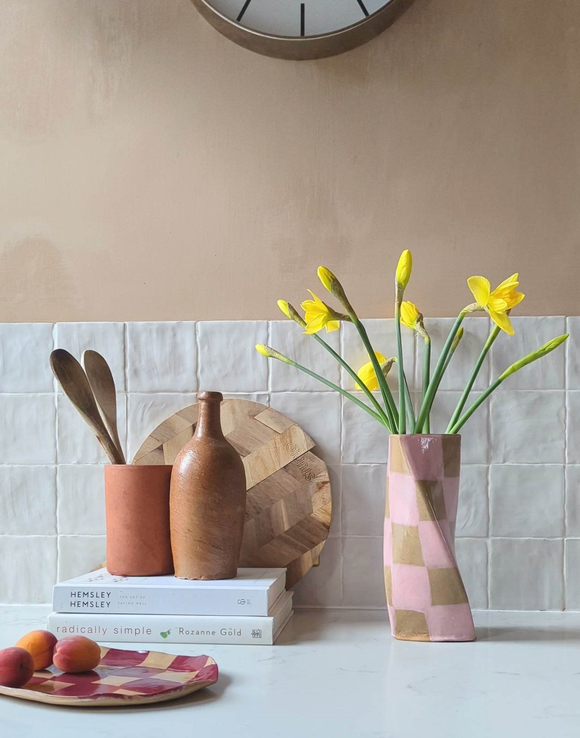 Our ceramic stoneware twisting checked vase is a perfect statement piece for any mantel, sideboard or dining table. Designed and made by us in London, this charmer is completely waterproof and the perfect size for a large bunch of flowers.