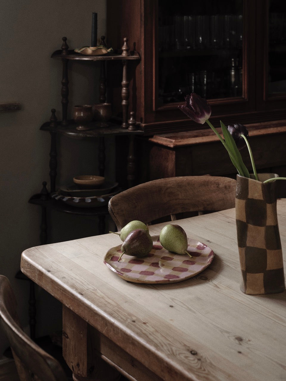 Our ceramic stoneware twisting checked vase is a perfect statement piece for any mantel, sideboard or dining table. Designed and made by us in London, this charmer is completely waterproof and the perfect size for a large bunch of flowers.